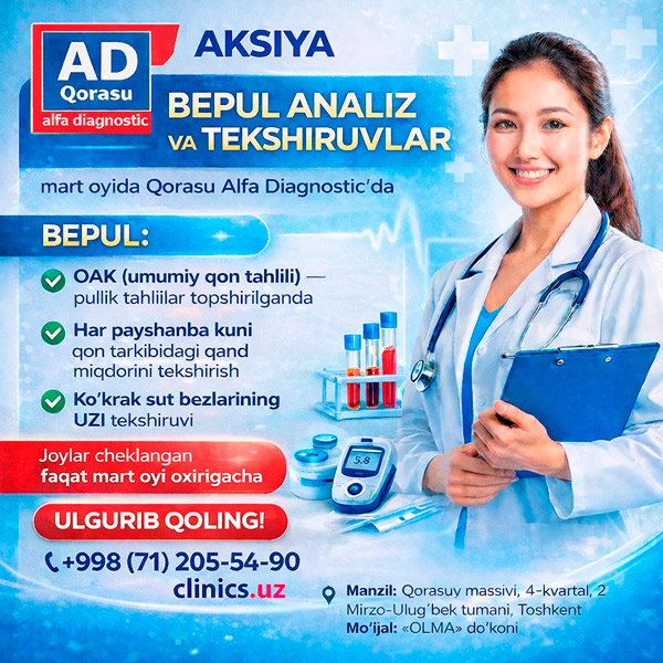 AKSIYA Qorasu Alfa Diagnostic da MART OYIDA BEPUL TAHLILLAR VA TEKSHIRUVLAR